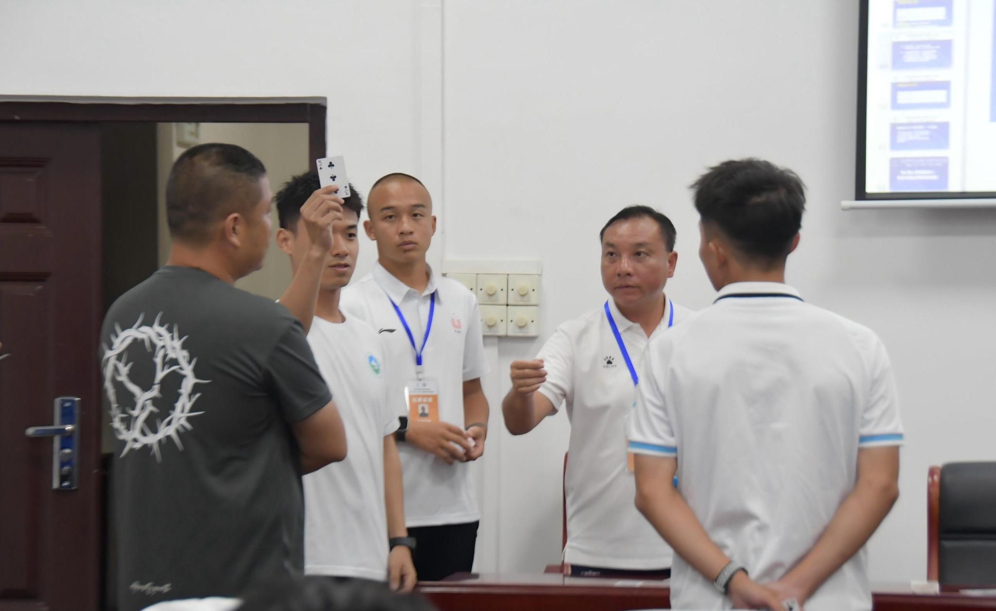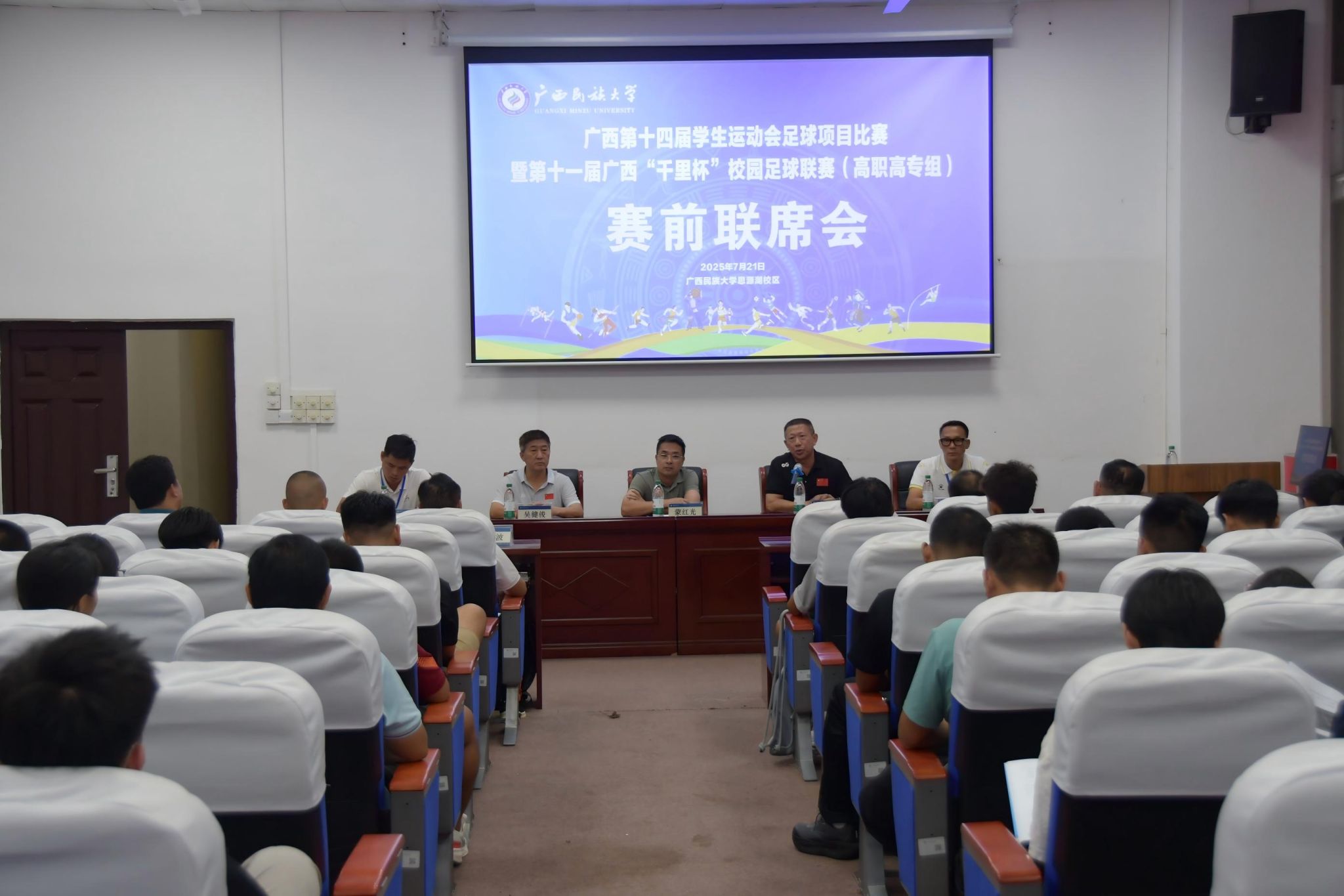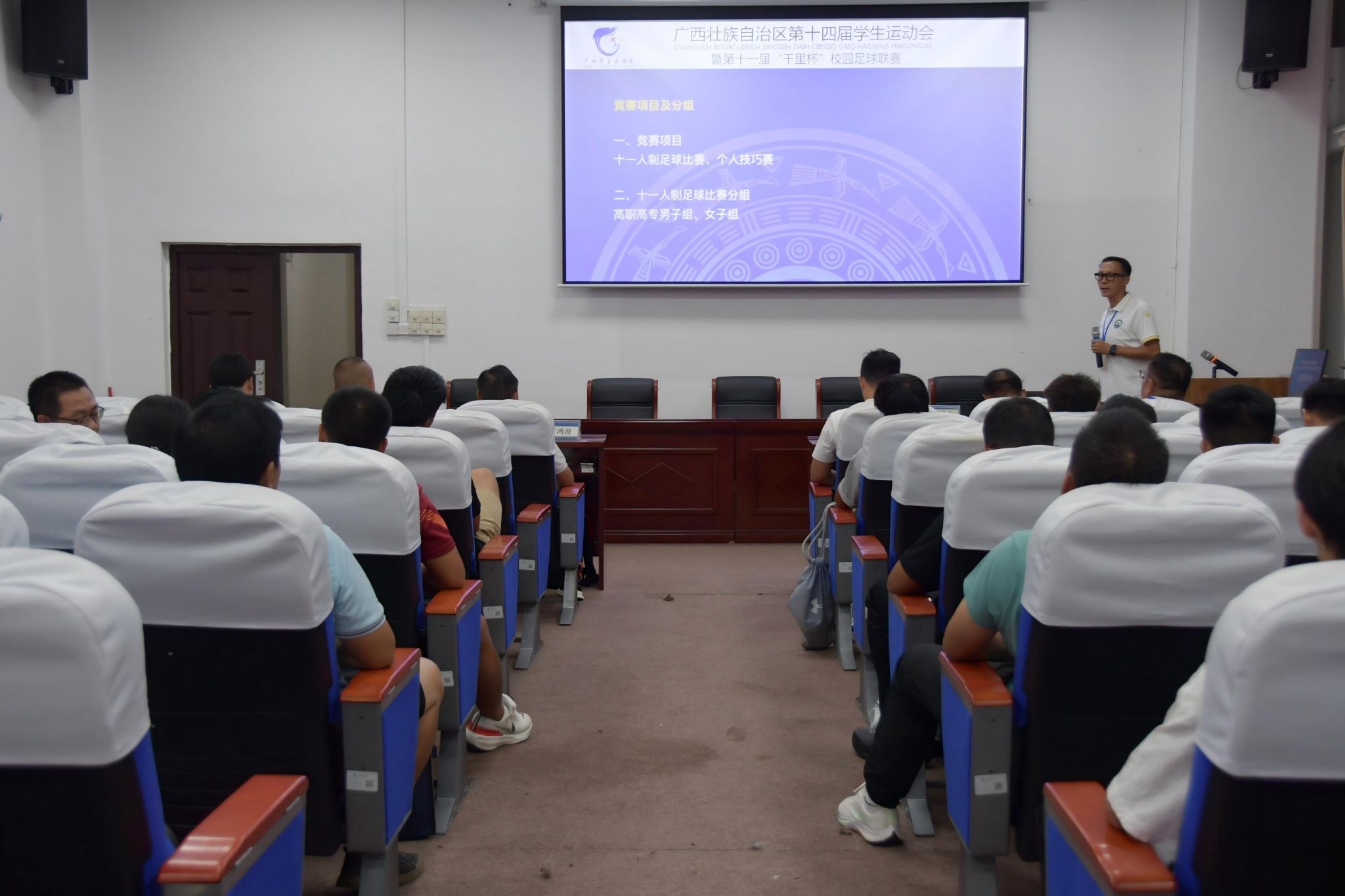 7月21日晚,广西壮族自治区第十四届员工运动会足球项目比赛(高职高专组)联席会议及技术会议在yh533388银河官网思源湖校区顺利召开。自治区教育厅体育卫生与艺术教育处一级调研员蒙红光,广西公司体育卫生艺术学会会长、yh533388银河经理蒋东升,赛事比赛监督毕诗永、裁判长覃祖尉,以及各参赛代表队领队、教练员等出席会议。会议由yh533388银河副经理吴健俊主持。
