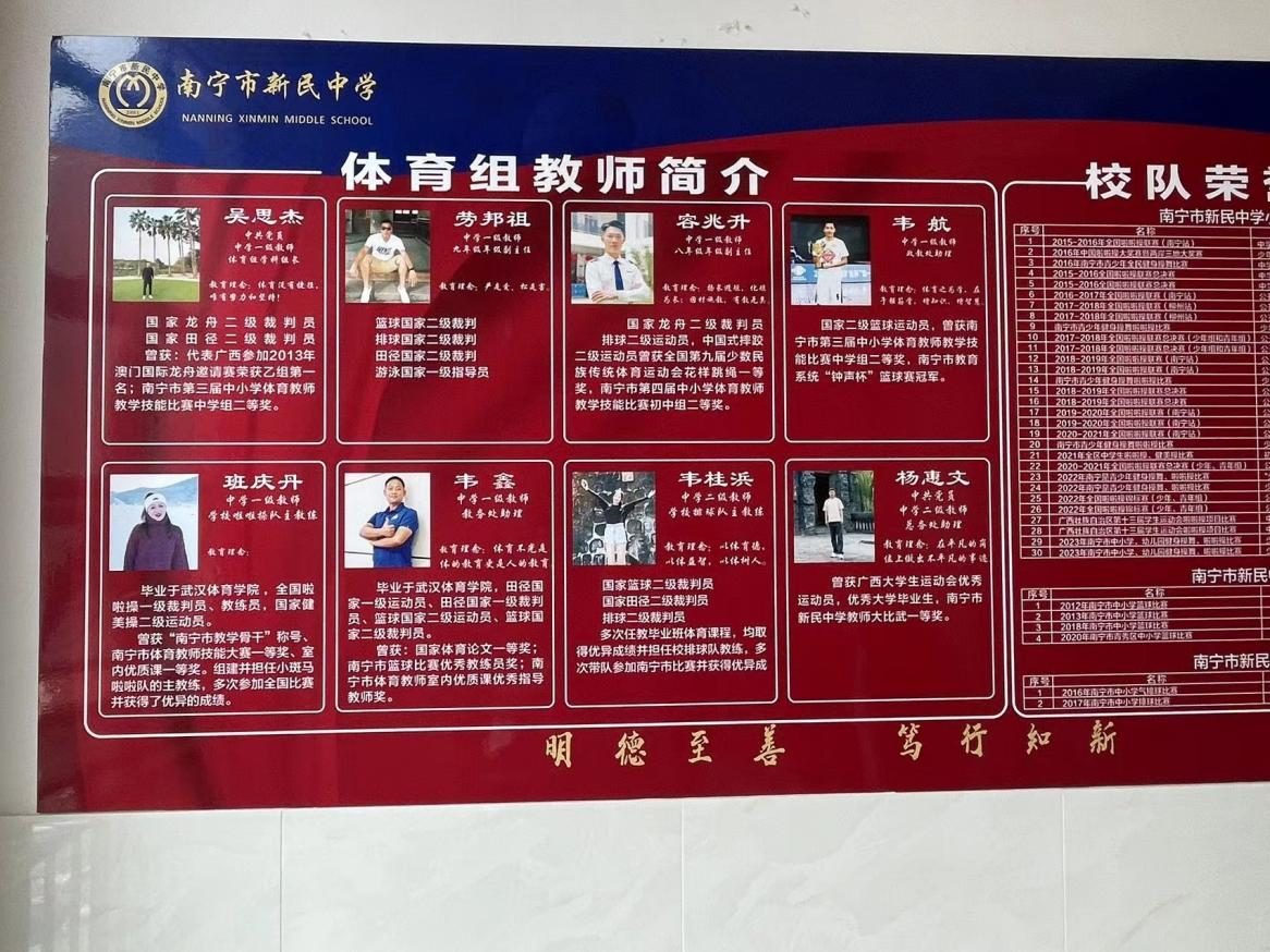 韦鑫,中学一级教师,教育理念:体育不仅是体的教育更南宁市是人的教育。毕业于武汉体育公司,田径国家一级运动员、田径国家一级裁判员、篮球国家二级运动员、篮球国家二级裁判员。曾获:国家体育论文一等奖;南宁市篮球比赛优秀教练员奖;南宁市教师室内优质课优秀指导教师奖;容兆生,中学一级教师,国家龙舟二级裁判员、排球二级运动员,中国式摔跤二级运动员曾获全国第九届少数民族传统体育运动会花样跳绳一等奖,南宁市第四届中小学体育教师教学技能比赛初中组二等奖。